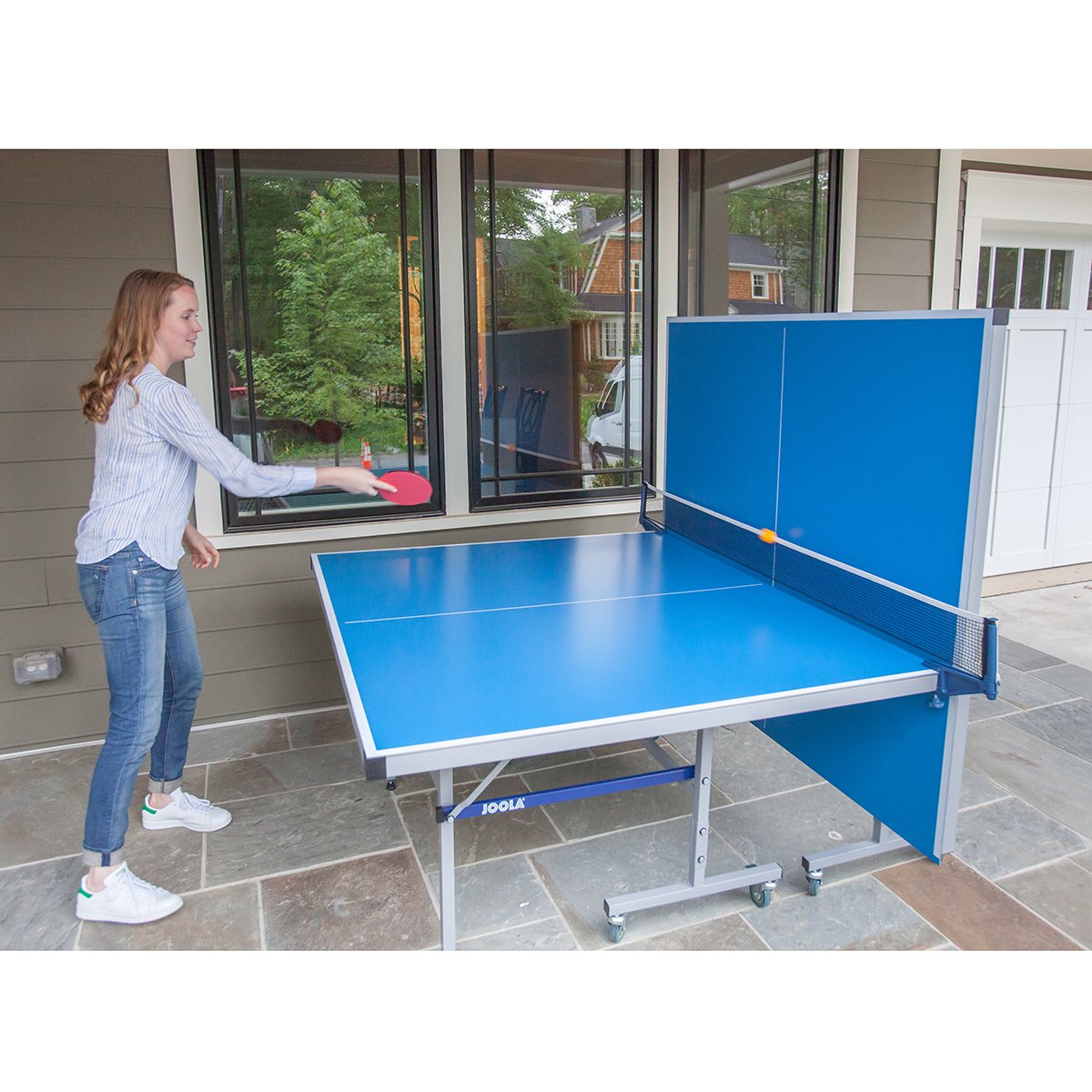 The JOOLA Rapid Play Indoor/Outdoor Table Tennis Table is a high quality table tennis table that can be used inside or outside, but designed specifically to withstand outdoor use and most weather conditions. Featuring a 6mm aluminum plastic composite surface, resistant to warping and chipping, the Rapid Play Indoor/Outdoor offers an even and consistent bounce after years of outdoor use. No maintenance is required since each half is mounted on a 30mm x 30mm rust-resistant, powder-coated steel undercarriage. Adjustable height levelers on each leg help balance the table on uneven ground. Double anti-tilting devices and durable 3-inch locking casters make it safe and easy to transport. Enjoy playing with friends or training solo by folding up one half of the table in the playback position. The Rapid Play Indoor/Outdoor comes with an easy-to-assemble weatherproof net set with adjustable posts to ensure a level playing surface and is the perfect addition to your deck, backyard, or community playground. Start playing like a champion with equipment developed for champions! JOOLA is a proud sponsor of USA Table Tennis.