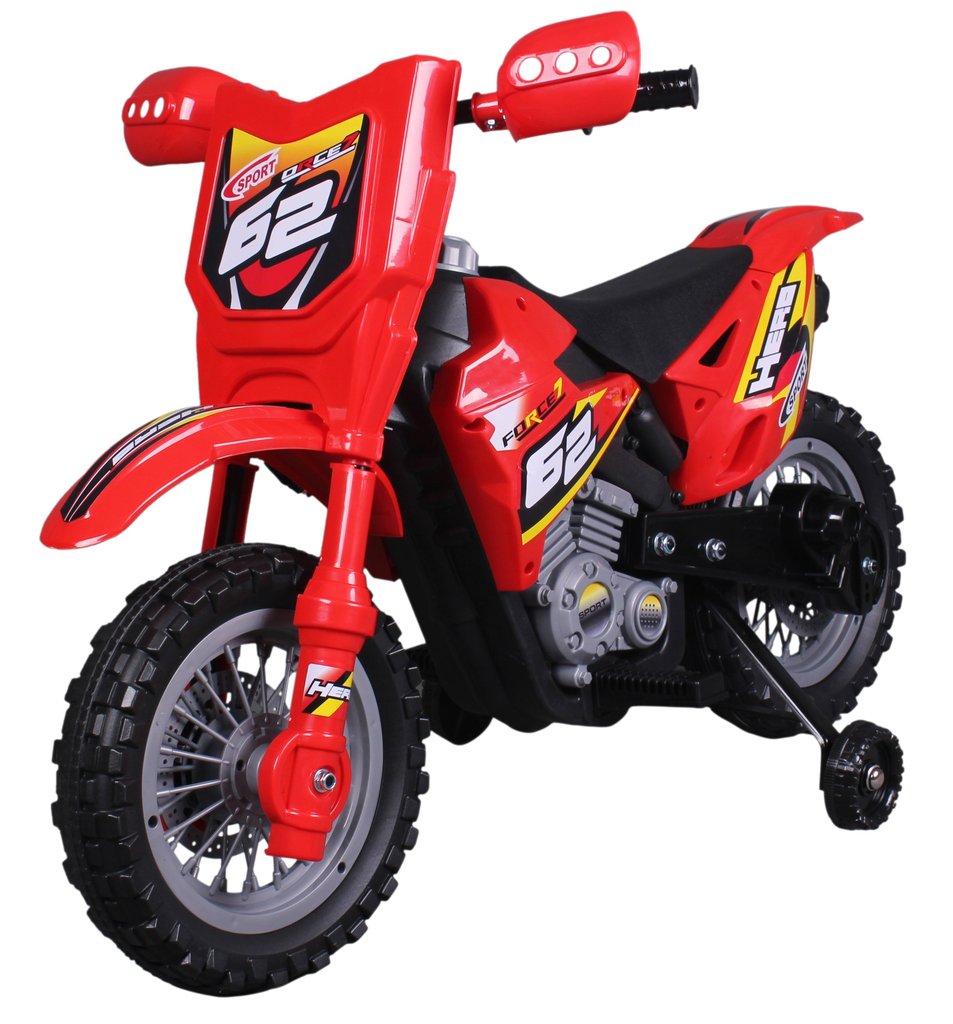 The Mini Motos 6v Dirt Bike is sure to be a blast! Comes with training wheels and cruises at 3 MPH.